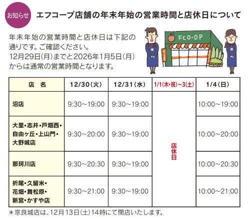 - 年末年始の配達や、店舗の営業時間は?