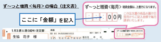 ◆注文書の場合:注文書の上部にある「ず~っと増資<毎月>」の記入欄に、毎月増資する金額をご記入ください。